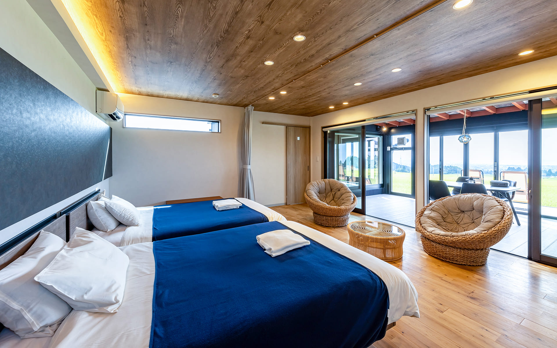4棟私人豪華露營別墅,備有3種房間類型可供選擇:推薦給情侶及攜帶小孩家庭的「2床型」、推薦給家庭的「4床型」、以及適合三代同堂或團體旅行的「6床型」。請按照需要選擇最合適的類型。
